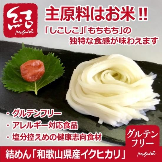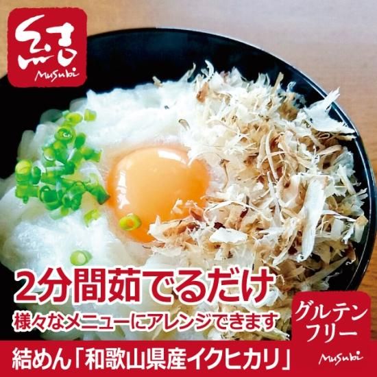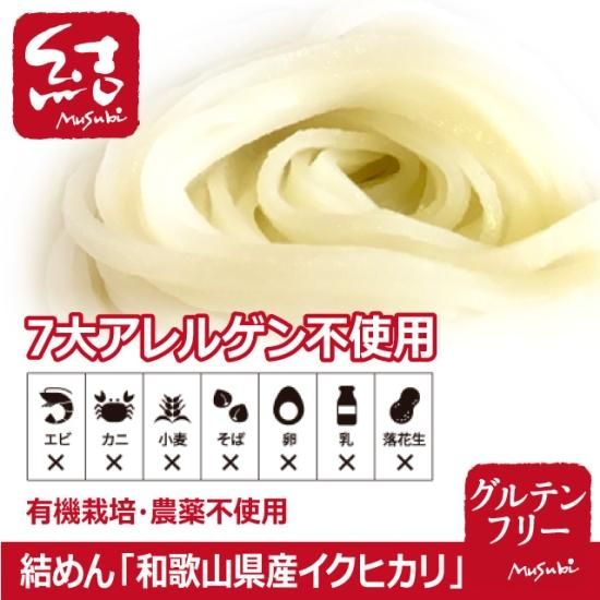 7大アレルゲン不使用、農薬不使用、農家さんの顔までわかる安心・安全な「結めん〜和歌山県産イクヒカリ〜」ぜひご賞味ください。